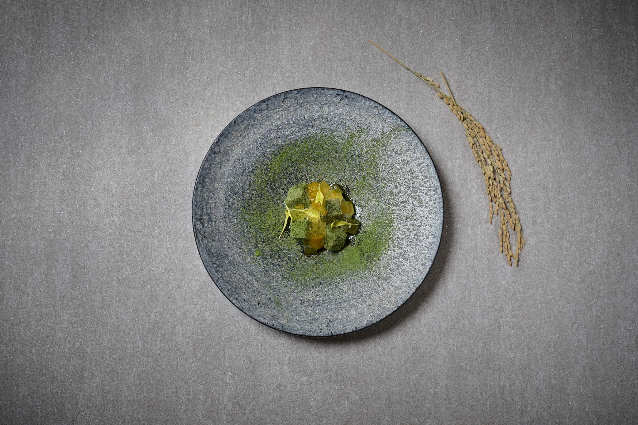合鴨米の米粉にヨモギを練り込んだ生地に、金柑のやさしい甘みと爽やかな酸味を合わせた一皿。静かに佇む冬の景色から、少しずつ春の息吹が芽生えていく。その移ろいゆく農場の情景を、味わいと香りで表現しました。(合鴨米 米粉)