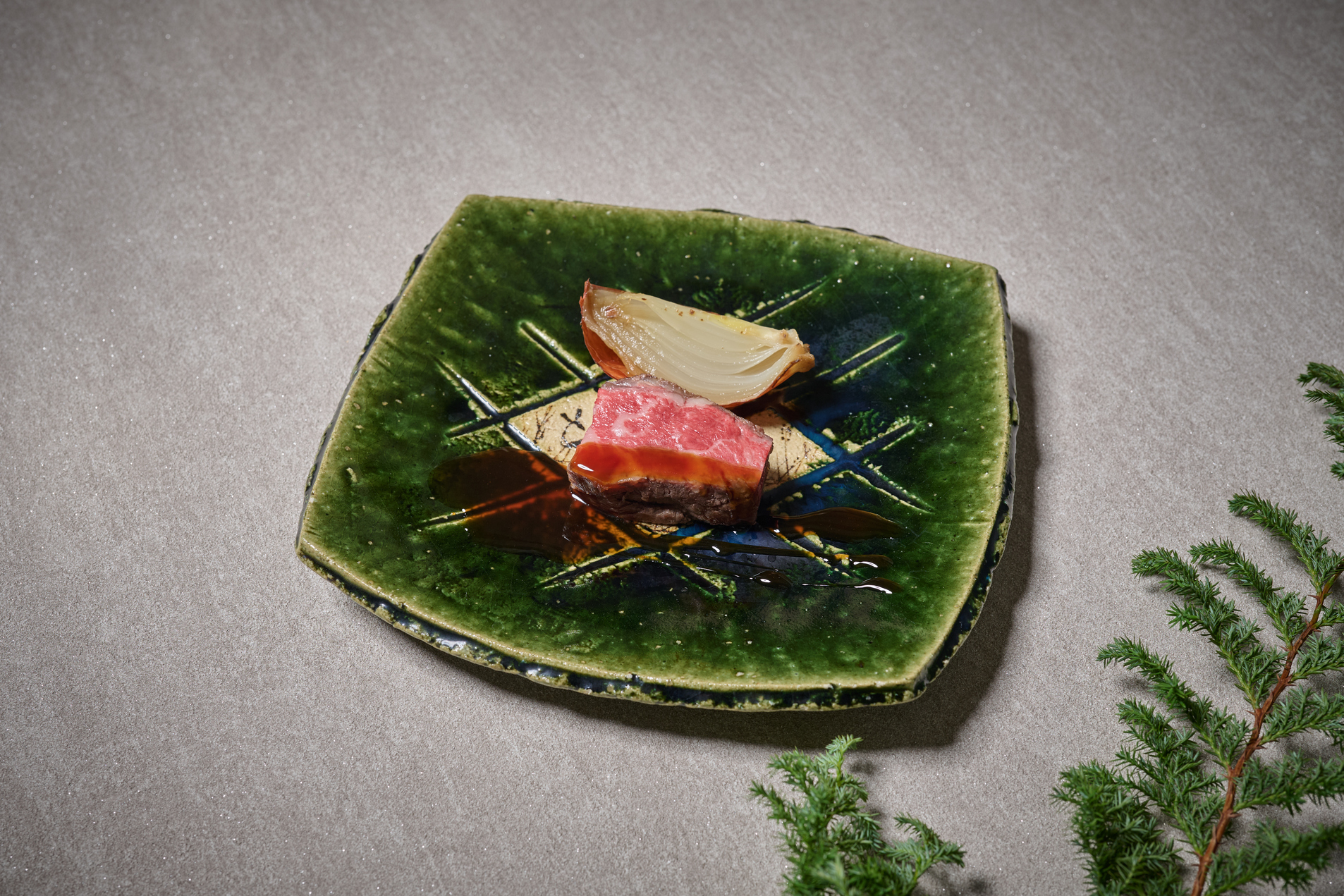 冬の寒さに耐え甘みが増した玉葱を、素材そのままの味わいを生かすため皮付きのままグリルに。牛ヒレ肉の旨味が、玉葱の自然な甘さと寄り添い、豊かなマリアージュを生み出します。ソースはあえてシンプルに仕立て、古野農場のお米からつくられた純米酢と黒味醂を使用することで、澄んだ酸味と奥行きを添えました。(玉葱、合鴨米純米酢)
