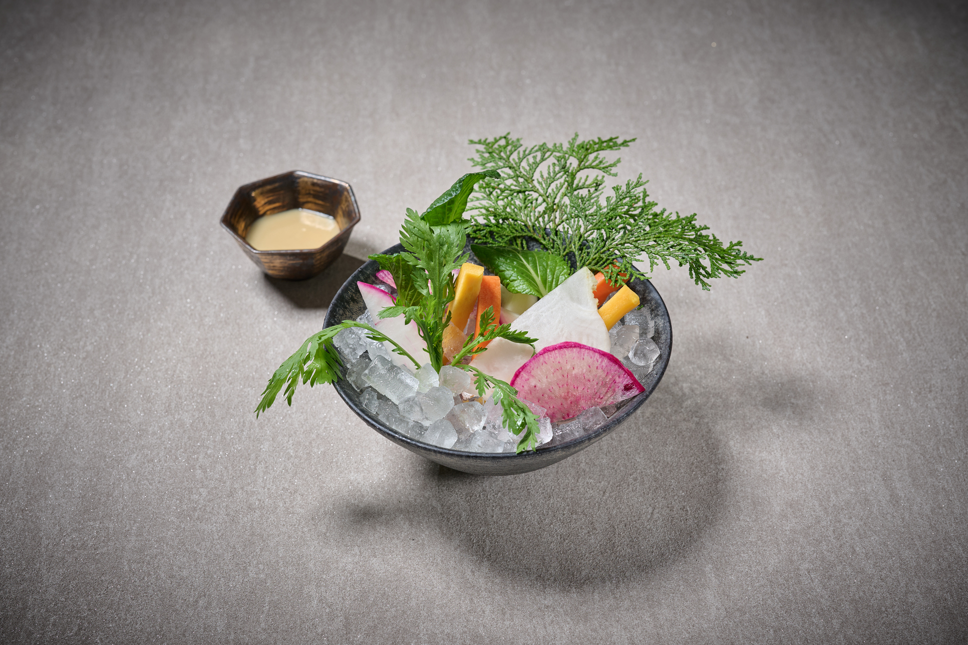 野菜のみずみずしさを味わうバーニャカウダ。ソースには酒粕と西京味噌を使用し、野菜の甘さをより引き立てる“熟成のコク”を加えました。上品な香りとともに、ふくよかで奥行きのある味わいをご堪能ください。(古野農場の食材:人参、牛蒡)